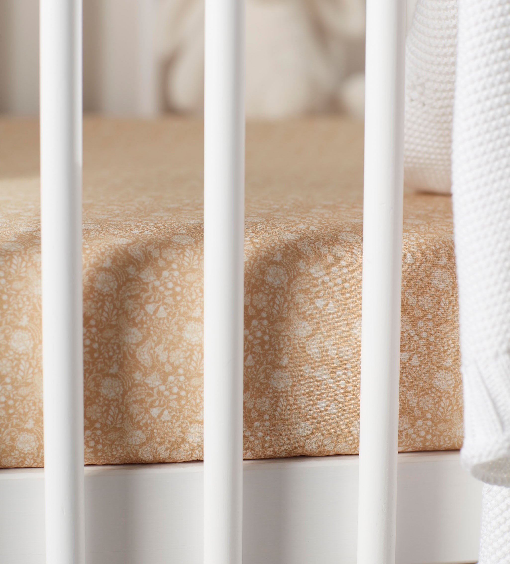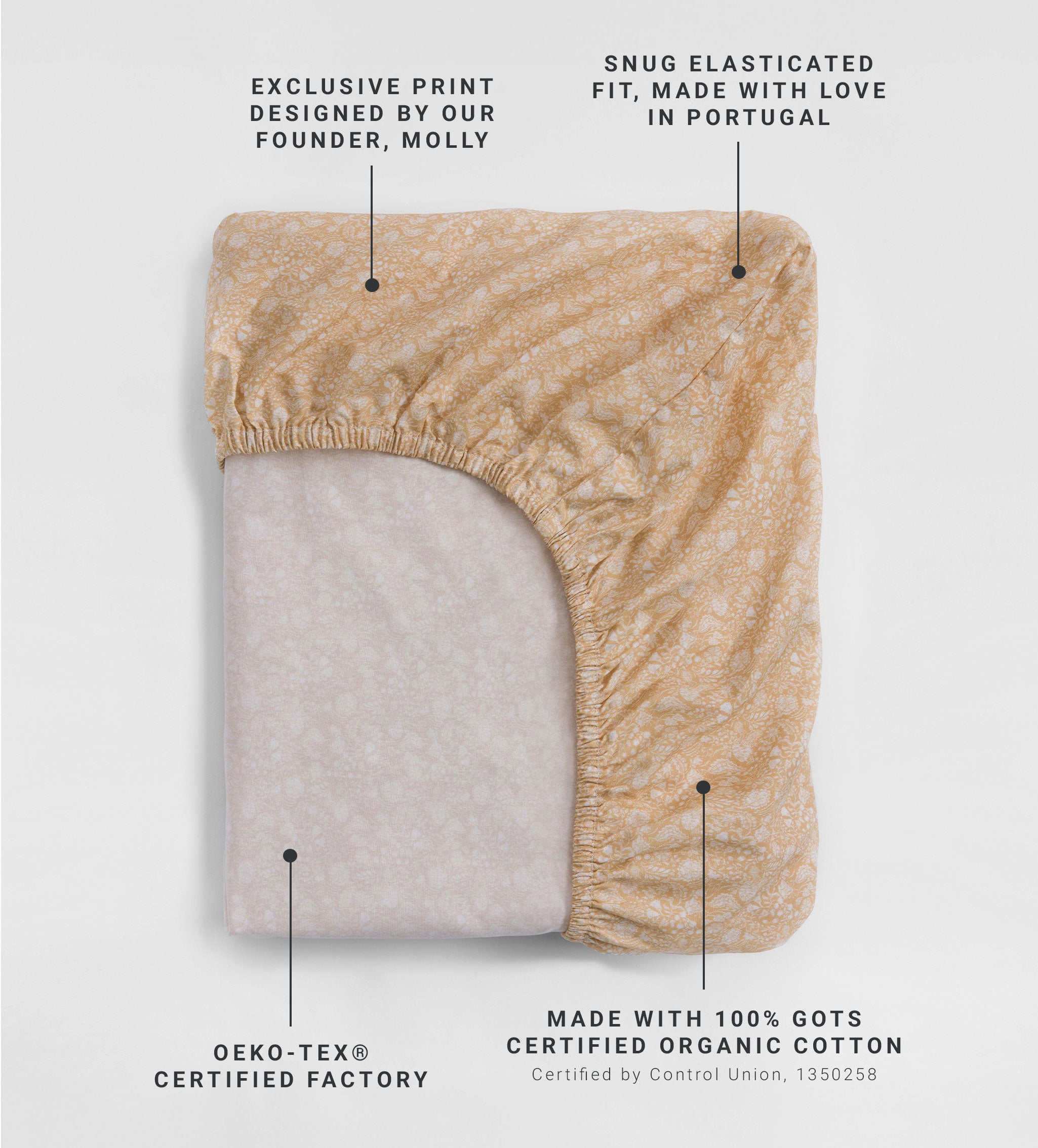 Our Honey Elle 100% Organic Cotton Fitted Sheet is adorned with a gentle floral design in a deliciously warm honey yellow. Crafted from GOTS certified organic cotton, it’s gorgeously soft and gentle on young skin. A perfect choice for creating a peaceful and cosy sleep space for your little one.