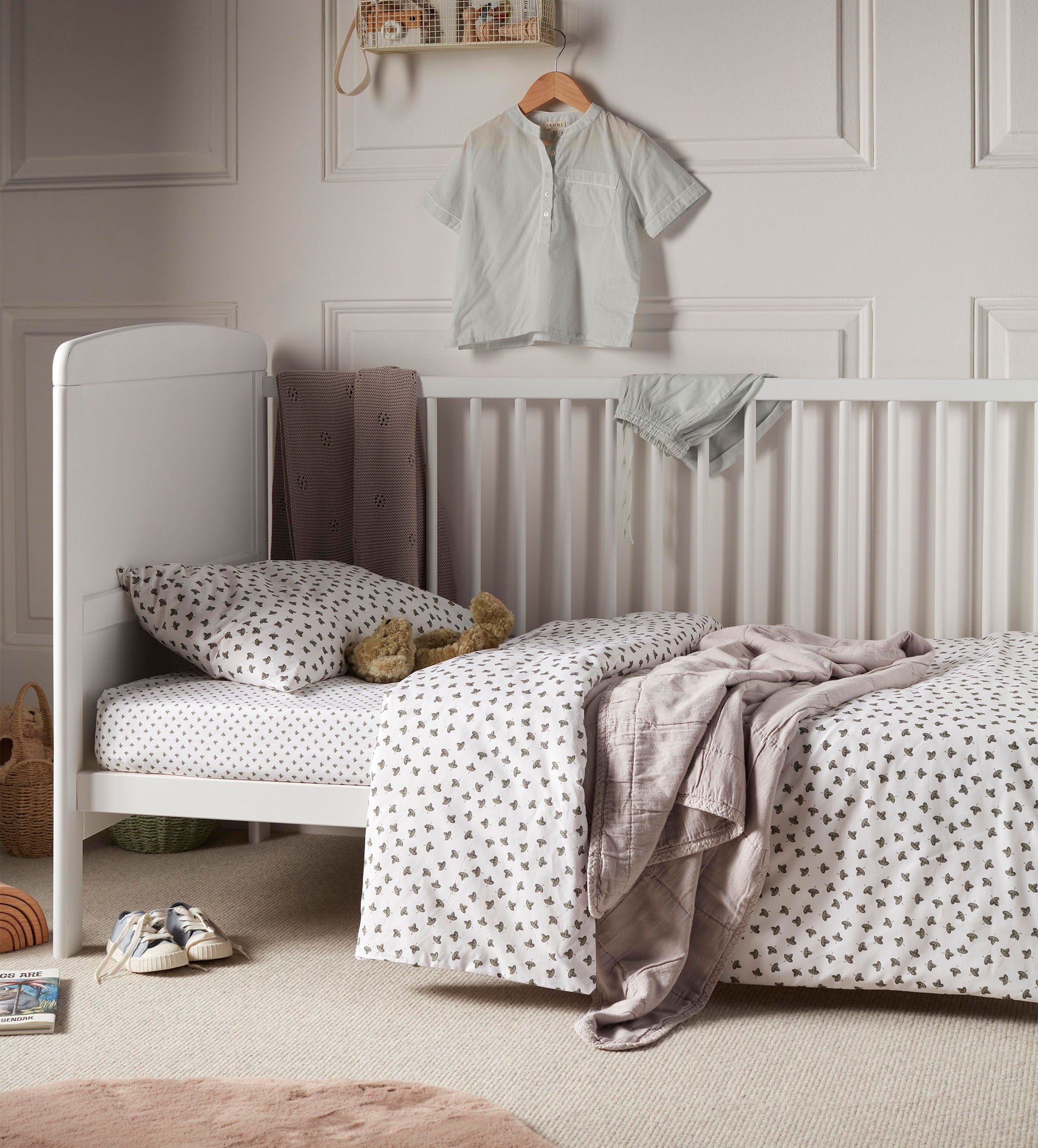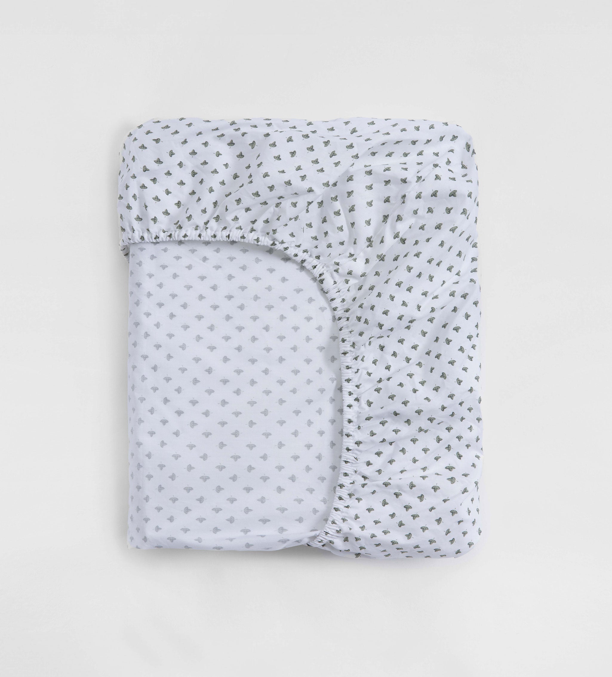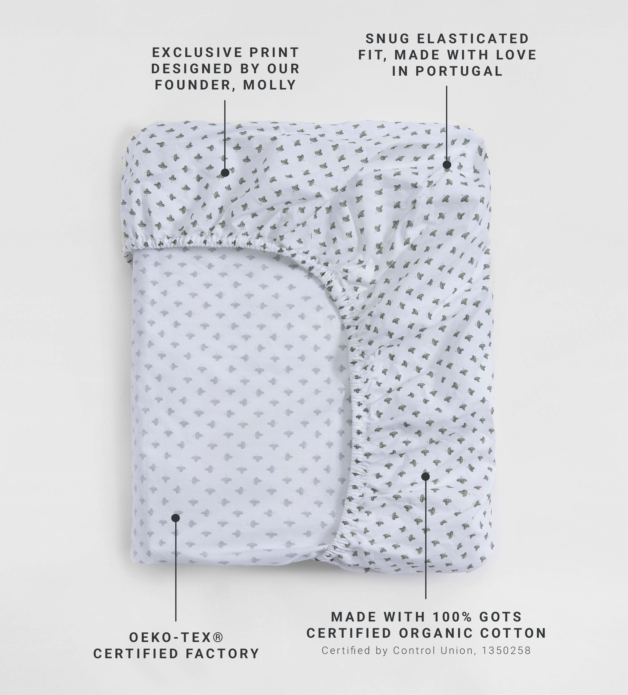 Our Olive Little Leaf 100% Organic Cotton Fitted Sheet brings a little bit of nature's magic to bedtime. Featuring a charming hand-drawn leaf pattern, this sheet is made from the loveliest GOTS certified organic cotton, making it soft and gentle for delicate skin. Pair with our Olive Little Leaf 100% Organic Cotton range to create a serene, woodland-inspired sleep space.