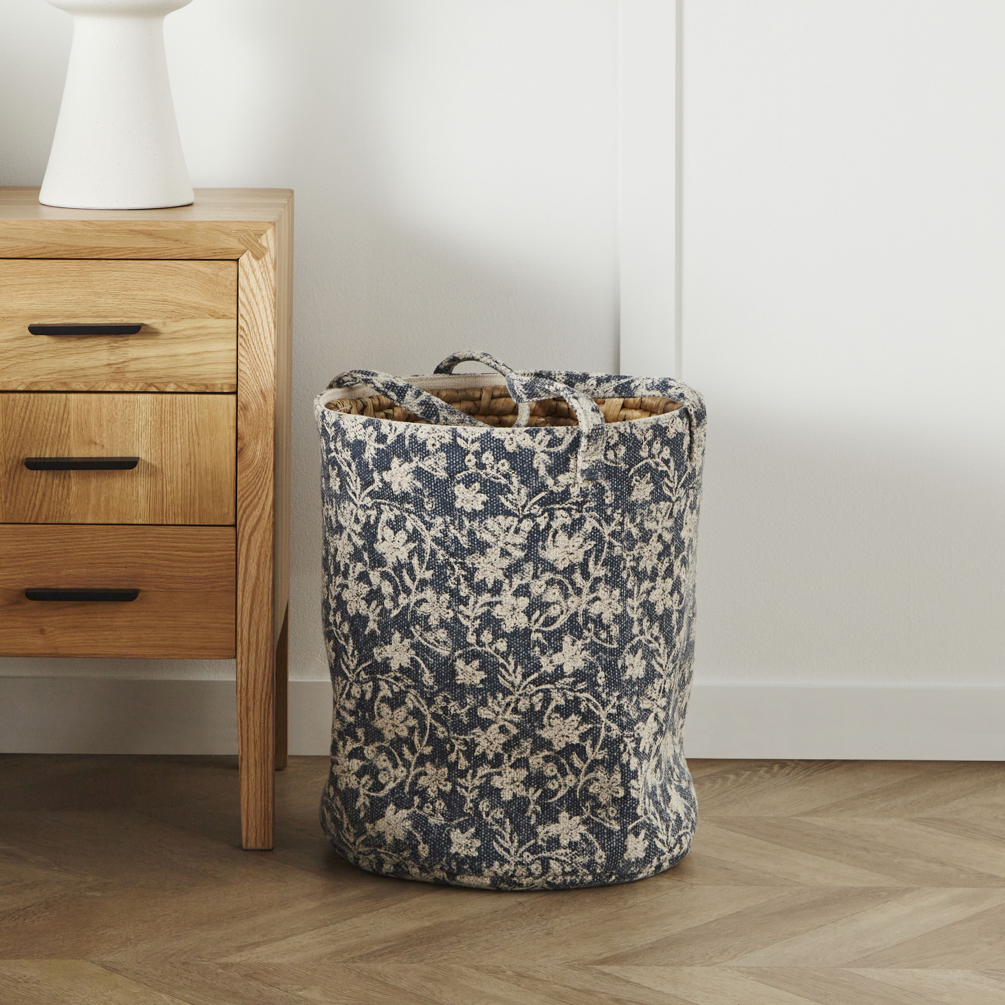 Enhance your living space with the Fleurs Indigo Cotton DhurrieBasket in Large (45x40cm). Crafted from durable Cotton Dhurrie, this generously-sized basket features an elegant indigo and white floral pattern, infusing rustic charm into your decor. Practical and stylish, it effortlessly declutters your space, serving as storage for blankets, magazines, or a chic plant holder.