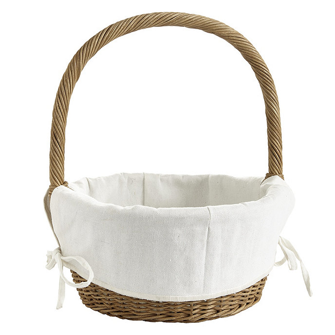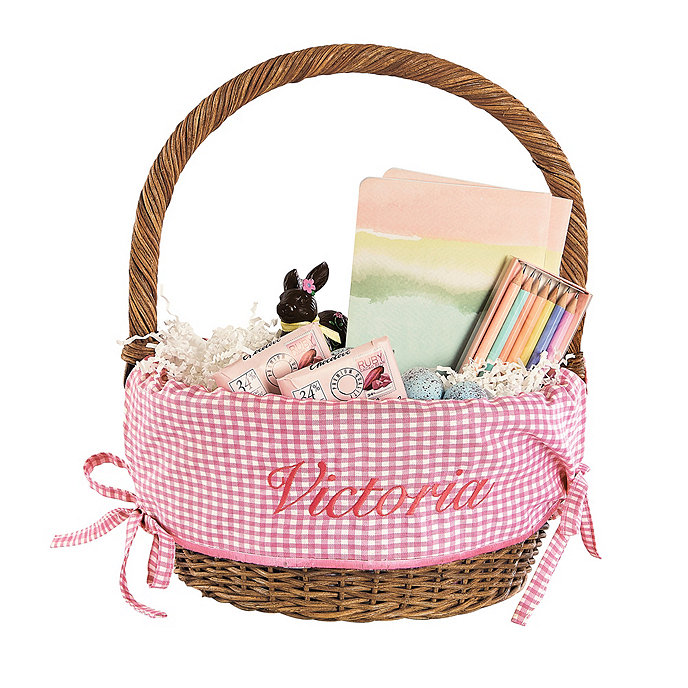 Instant Easter Classics. This iconic Wicker Basket is hand woven of honey-toned rattan with tall loop handle for easy candy toting and egg hunting. Add a monogram to the liner to make it even more special. Wicker Basket with Liner features: