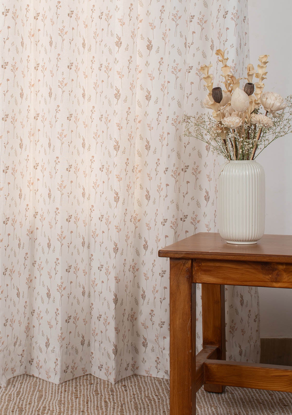 A charming floral cotton curtain sprinkled with dainty wildflowers in soft shades of neutral cream and blush pink. The delicate, nature-inspired print brings a countryside whimsy and a breath of fresh air to your home. It’s the perfect cotton curtain for the living room if you're looking to add softness without overwhelming the space. The minimal print cotton curtain pairs beautifully with natural wood tones and earthy textures.
