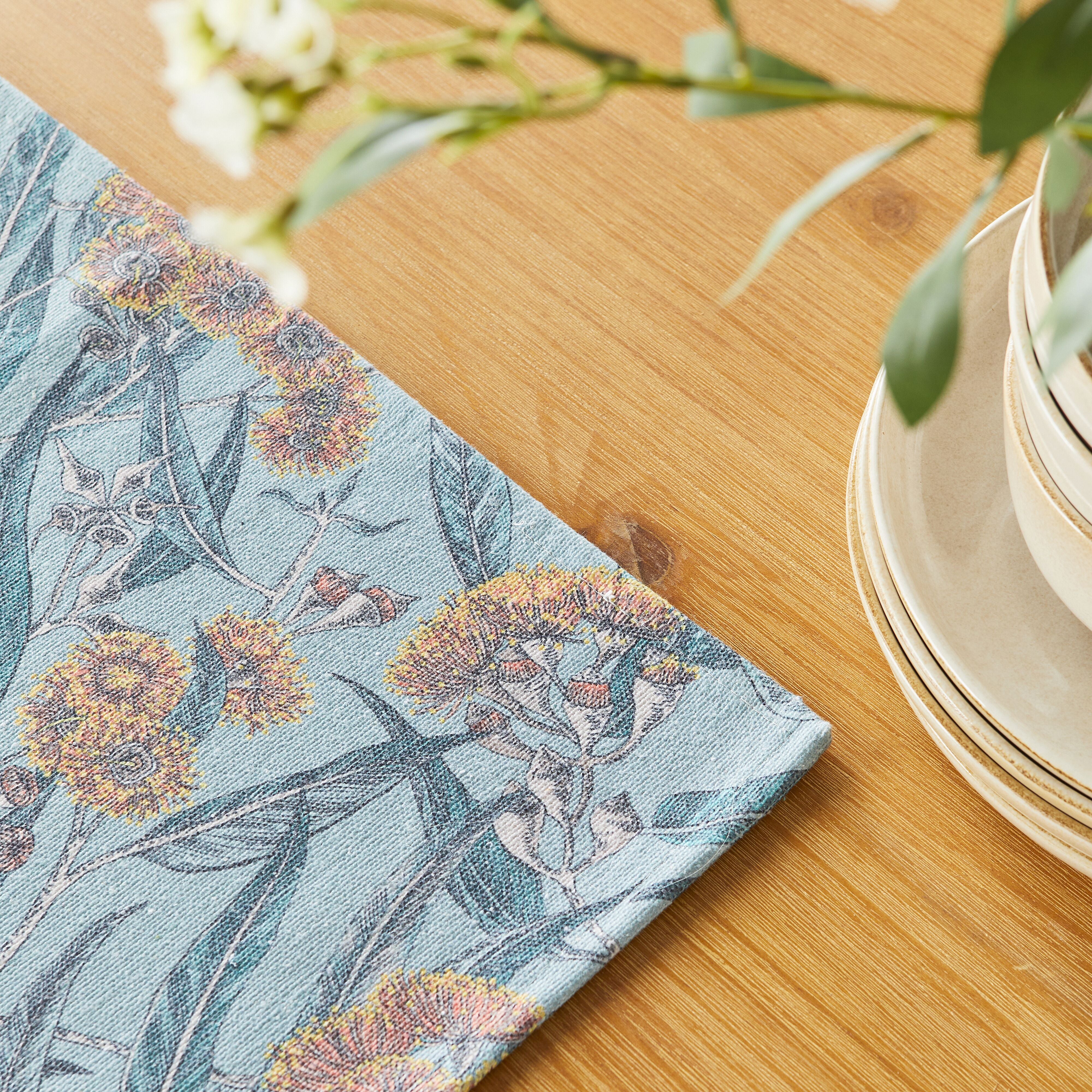 Brighten up your table with the Aruba Orange Gum Nut Placemat. Featuring a beautifully illustrated design with blue and yellow gum nuts and green leaves on a light blue background, this placemat is perfect for both indoor and outdoor use. Made from eco-friendly 100% recycled PET, it adds a touch of natural beauty to any dining space.