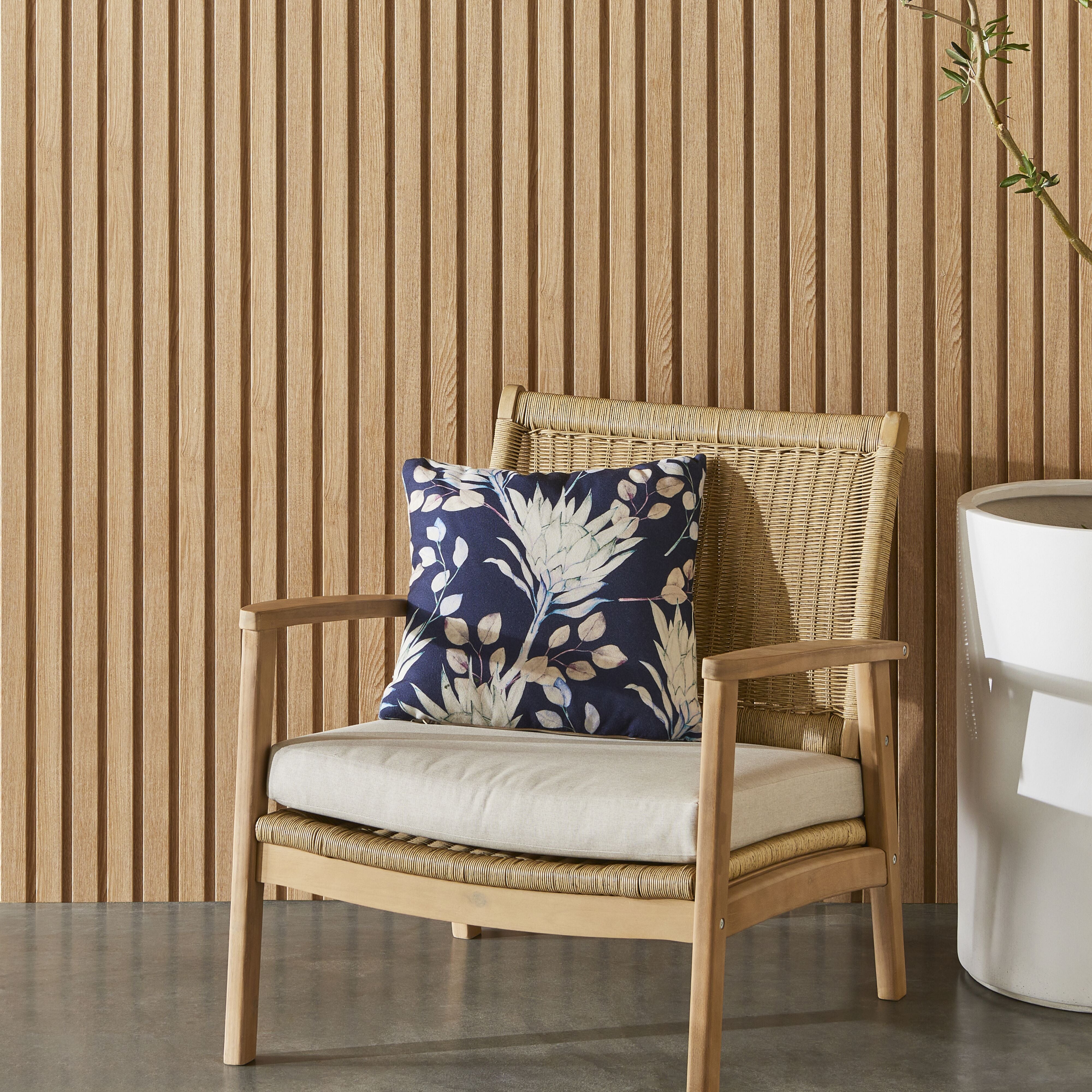 Enhance your living space with the Aruba Outdoor Indoor Protea Night Garden Cushion 45x45cm. This reversible cushion features soft pastel colours in a leafy Hamptons-inspired pattern on one side and a Mid-Century autumn floral design on a navy background on the other. Perfect for both indoor and outdoor use, it's made from eco-friendly 100% recycled PET, making it a stylish and sustainable choice. Pair it with the Aruba Linea Flower Cushion for a coordinated look.