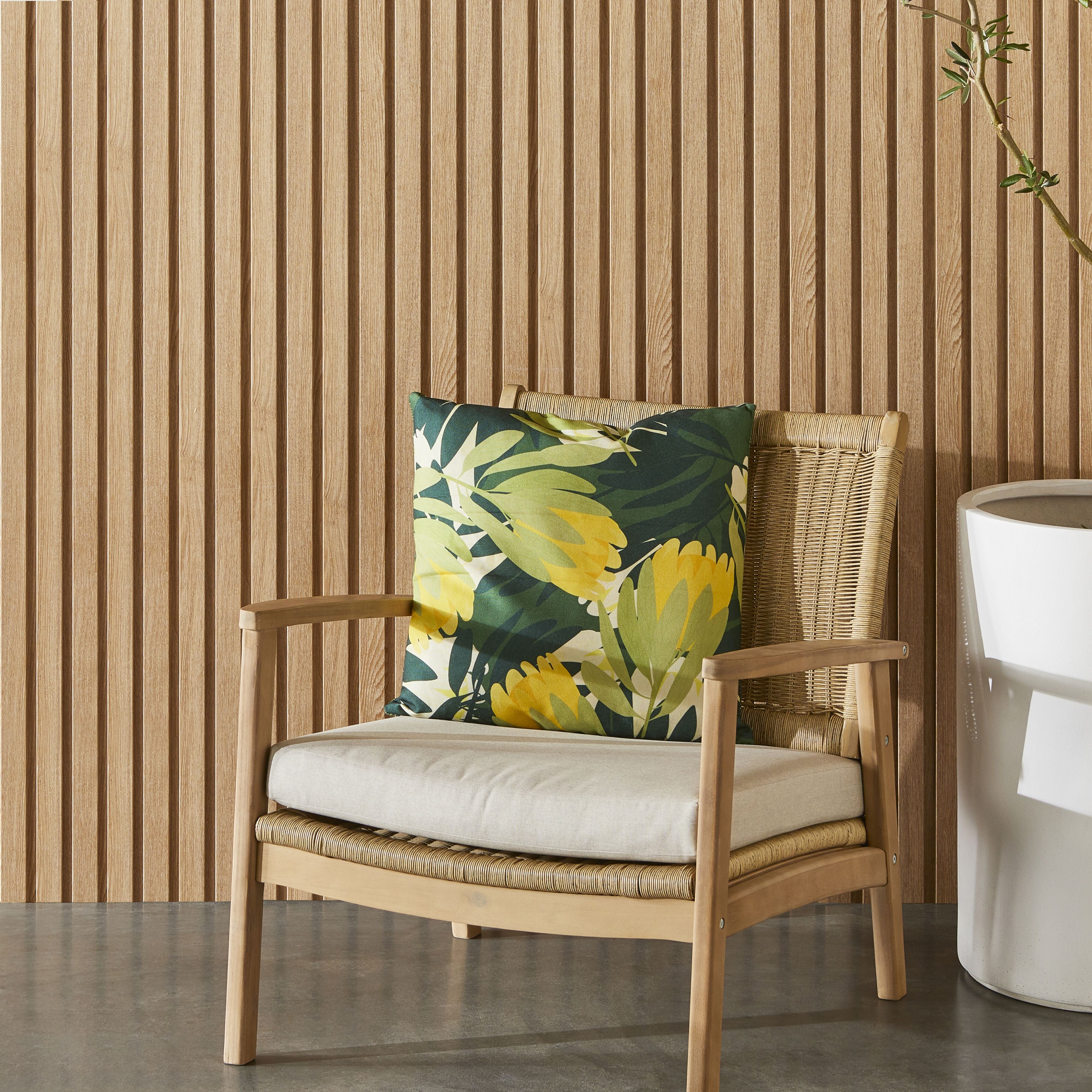 Add a touch of nature to your space with the versatile Aruba Outdoor Indoor Yellow Flower Cushion, 50x50cm. Crafted from eco-friendly 100% recycled PET, this cushion is designed for both indoor and outdoor use. Featuring a reversible design, one side boasts a green leafy pattern on a white background, while the other showcases a vibrant yellow protea floral print. This cushion provides an easy and cost-efficient way to refresh your interiors with its natural-inspired designs.